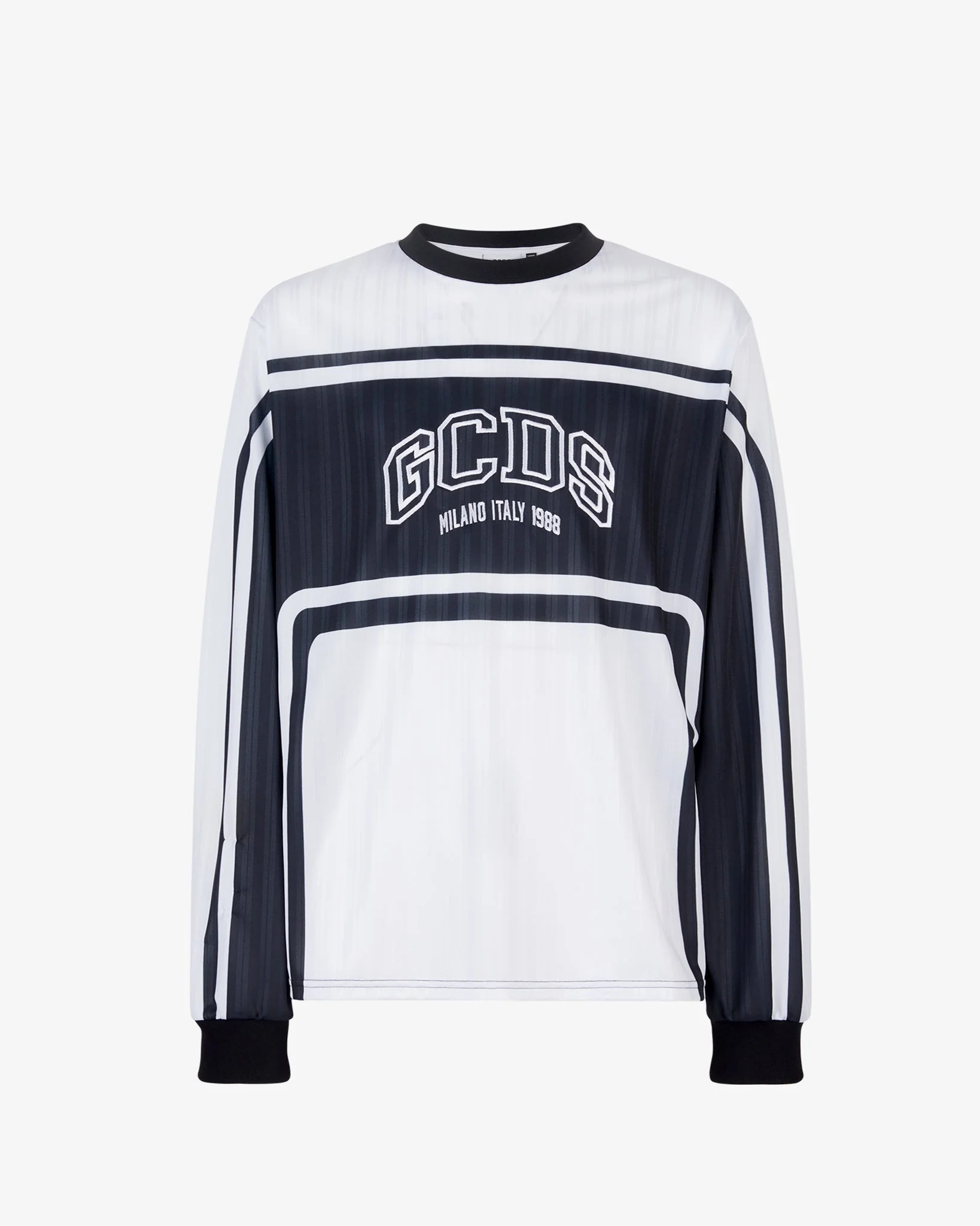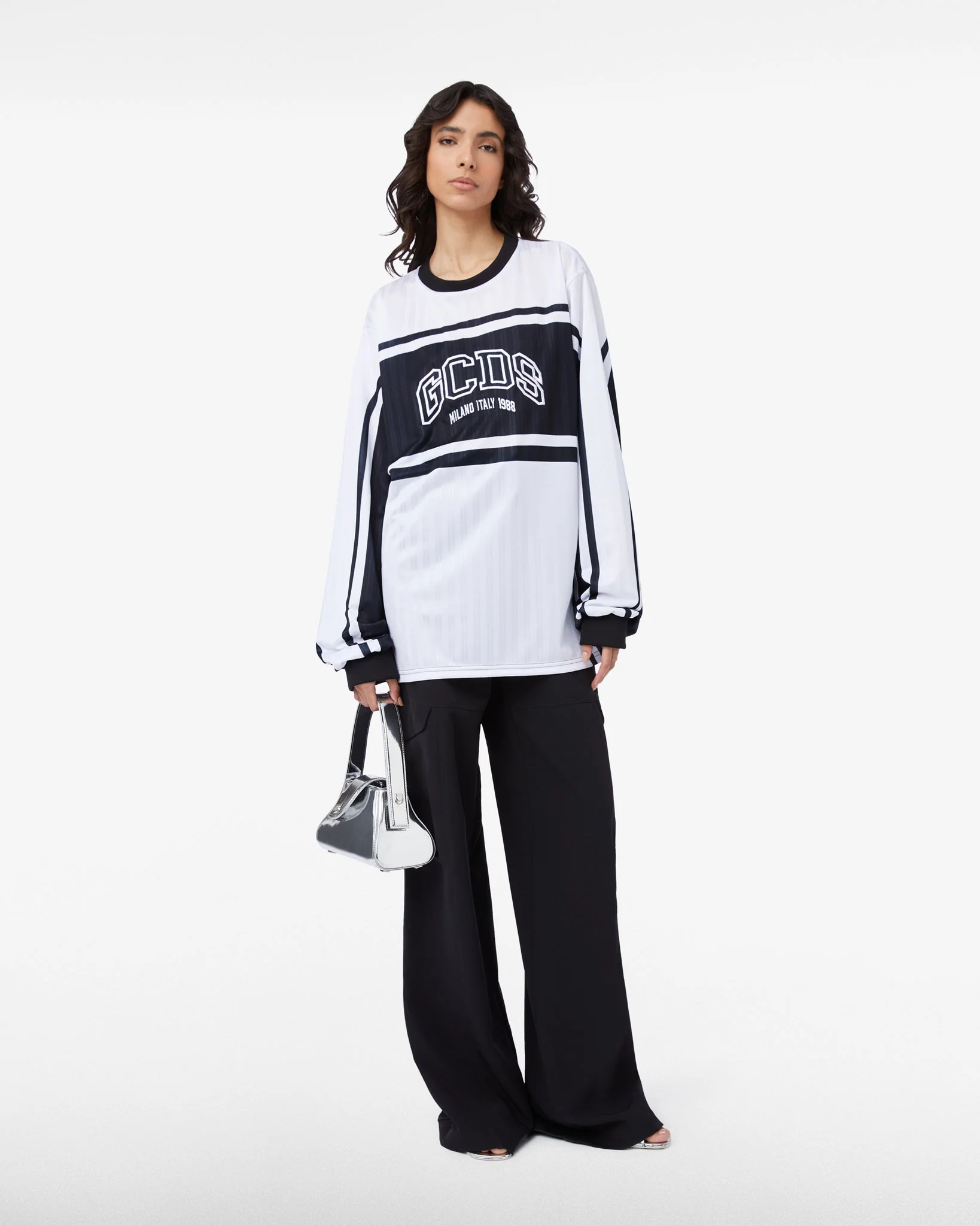 Inspiración deportiva en una camiseta de manga larga con diseño bicolor blanco y negro y logo central. Ligera y llamativa, es perfecta para destacar en outfits urbanos y streetwear.