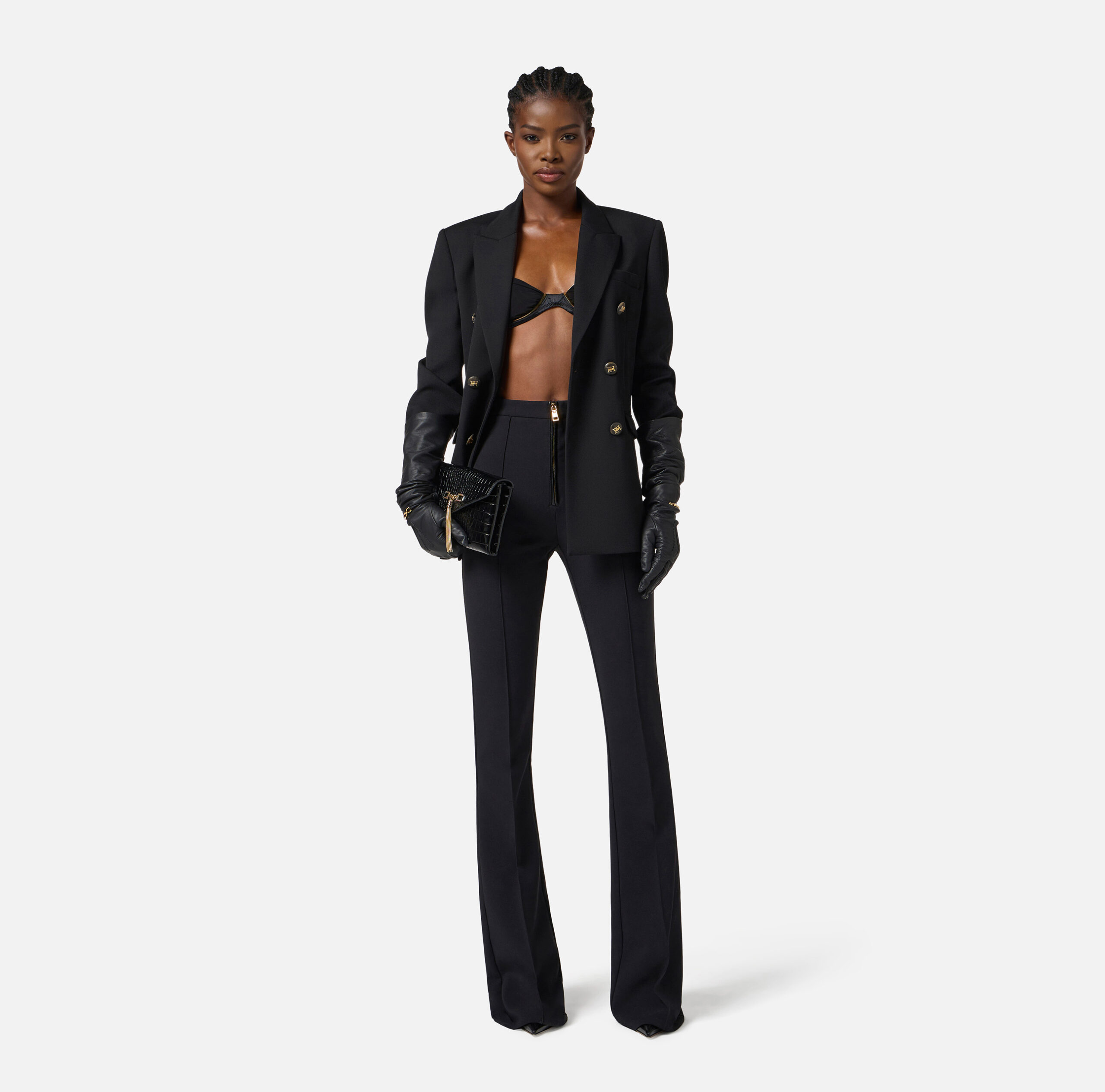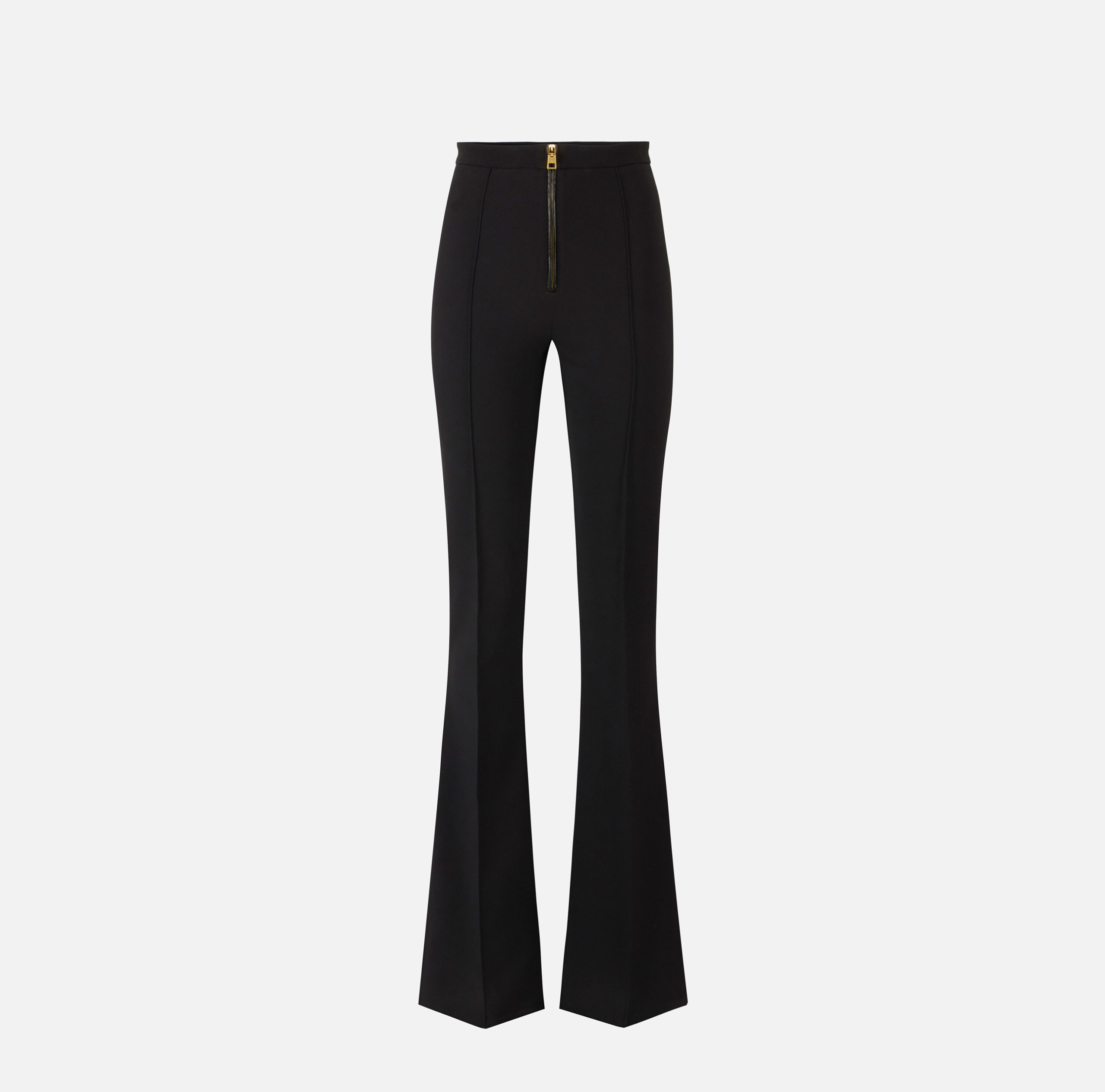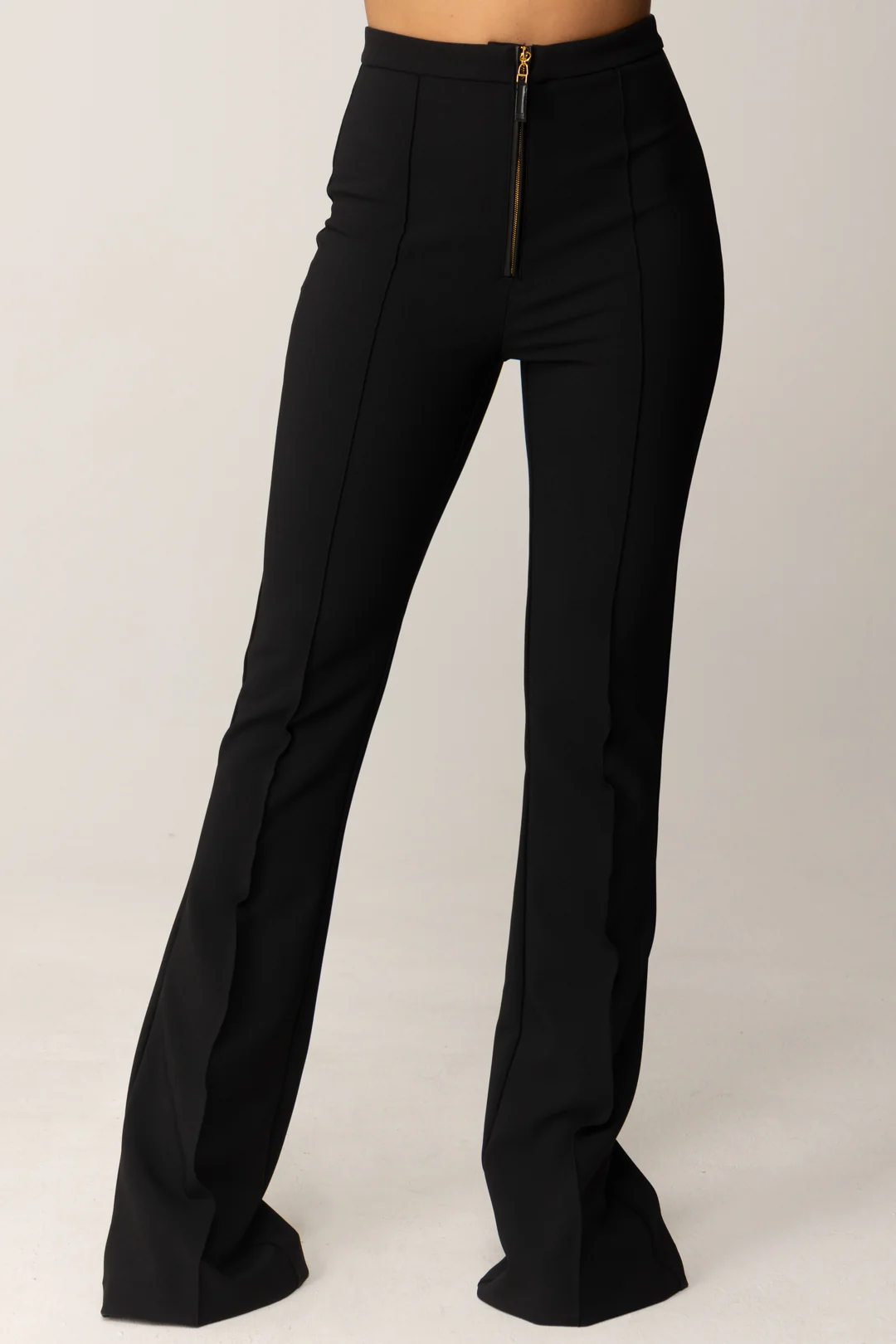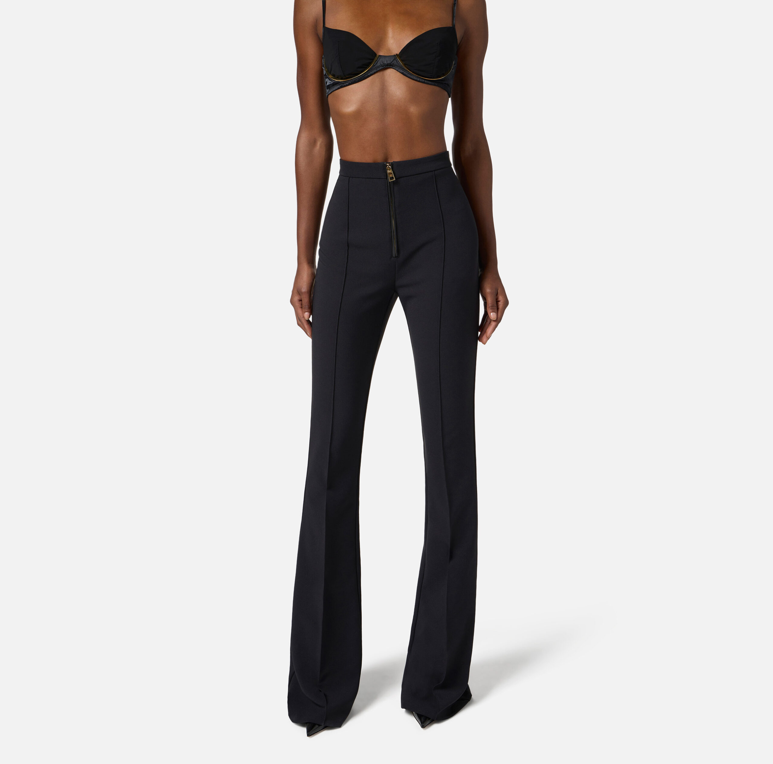 Pantalón negro de tiro alto con corte flare que alarga visualmente la silueta. Su diseño limpio incorpora cierre frontal y líneas estructuradas que aportan elegancia.