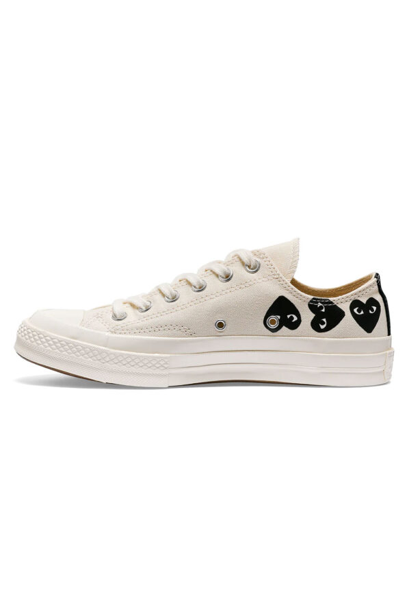 Versión en lona blanca con estampado lateral de múltiples corazones negros CDG Play. Clásico y alternativo a la vez. Forma de uso: Quedan bien en outfits claros o en contraste con prendas negras. Recomendadas para looks más creativos.