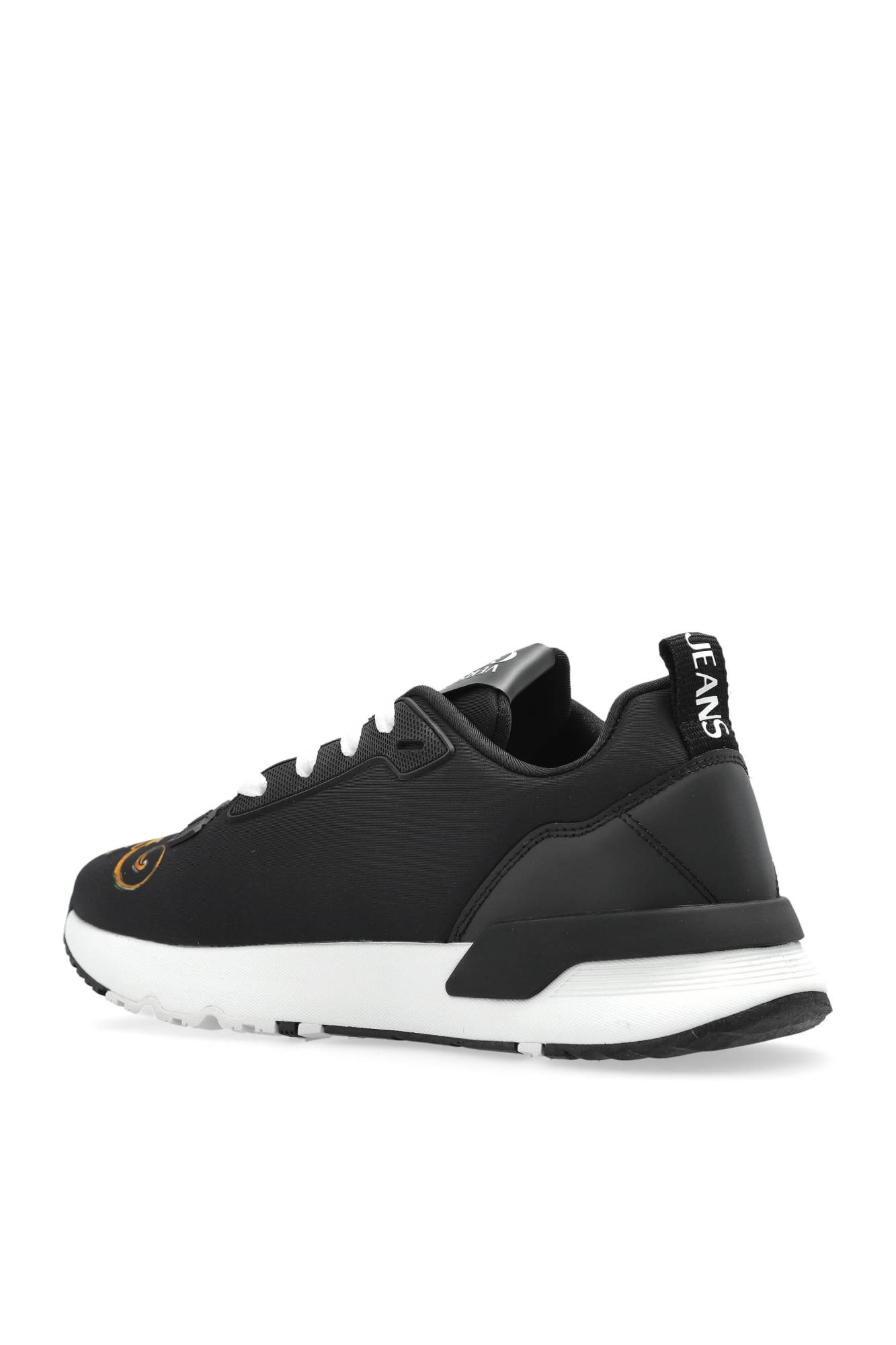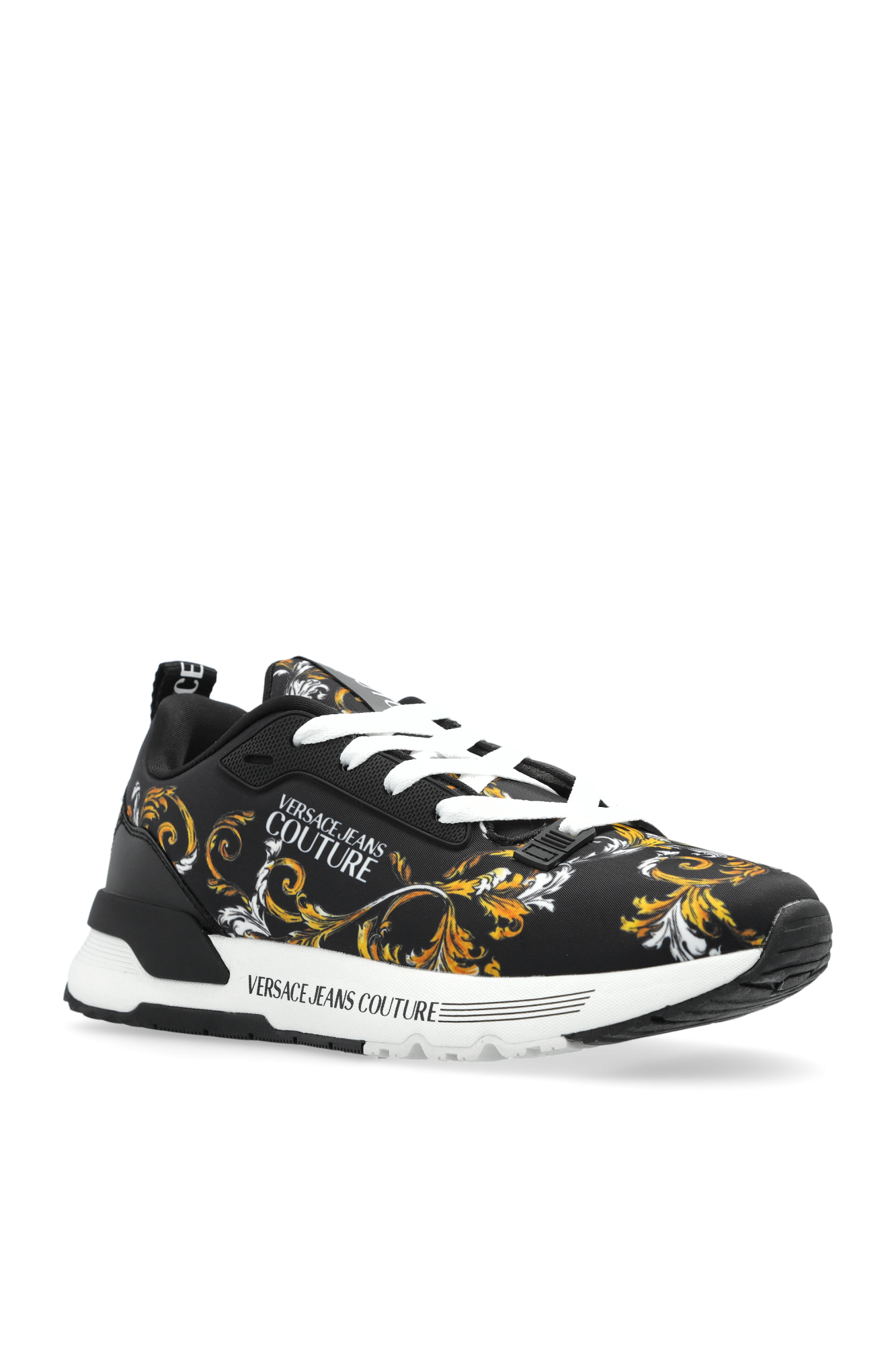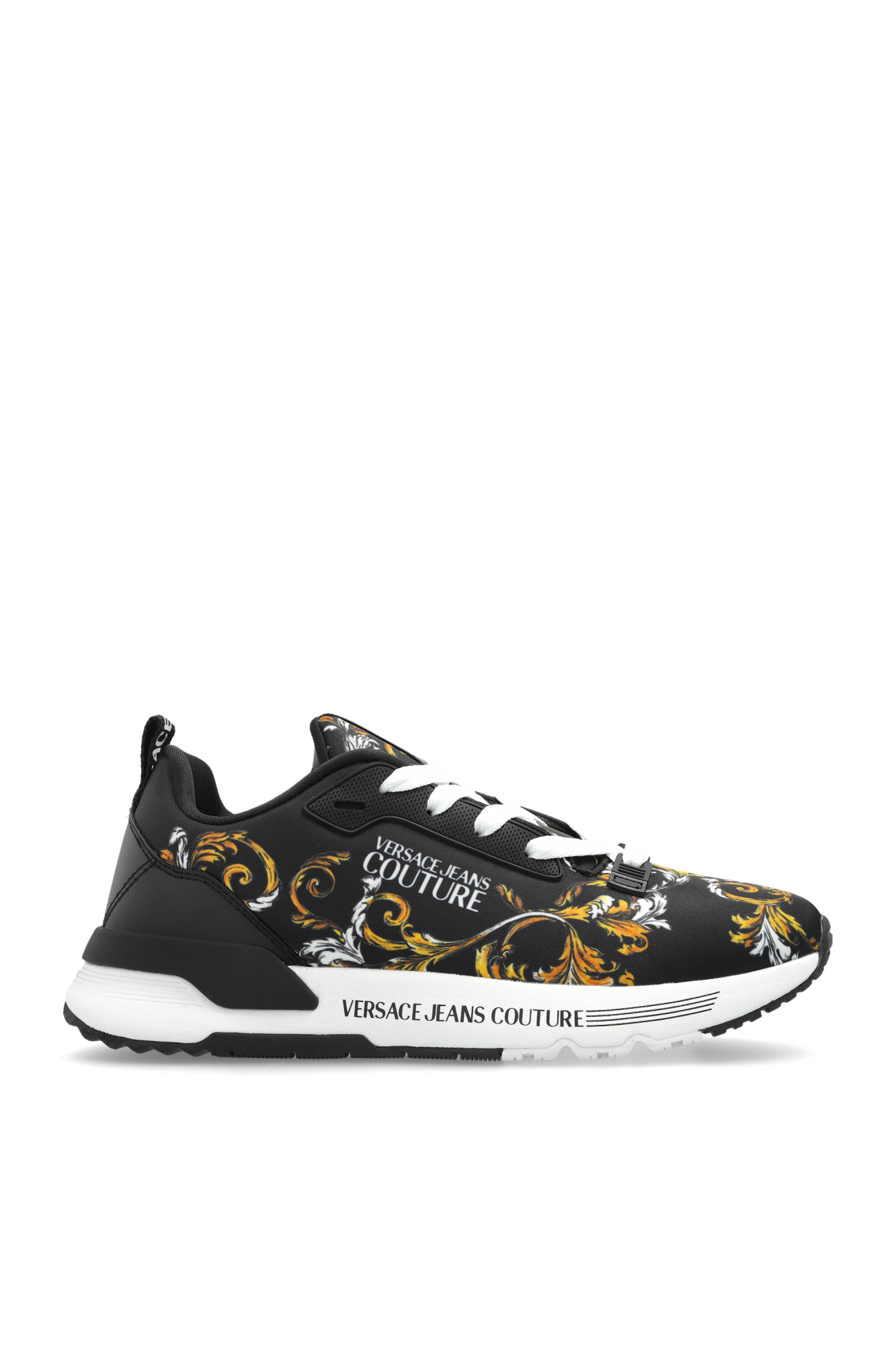 Zapatillas negras de estilo deportivo con el clásico estampado barroco en dorado y blanco. Con suela blanca y logo Versace Jeans Couture en el lateral, combinan comodidad con un diseño icónico.