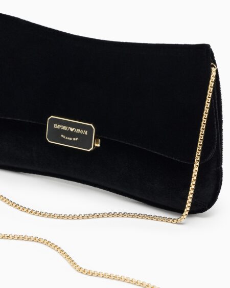 Cartera tipo sobre Emporio Armani confeccionada en elegante terciopelo negro con cierre frontal y cadena metálica dorada. Su diseño sofisticado y minimalista la convierte en el accesorio perfecto para eventos y ocasiones especiales.